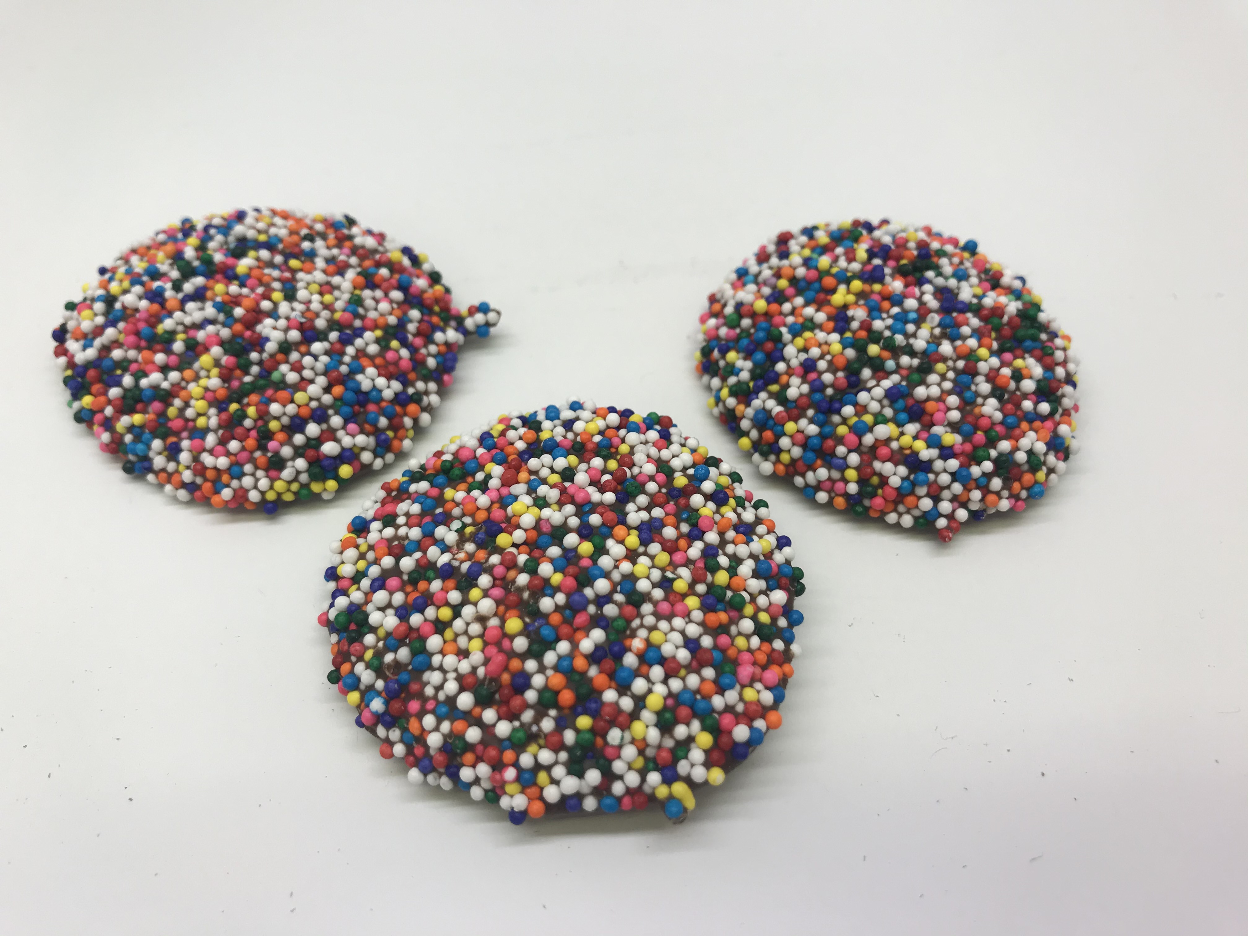 Homemade Kehrs Milk or Dark chocolate discs with a crunchy rainbow candy topping.